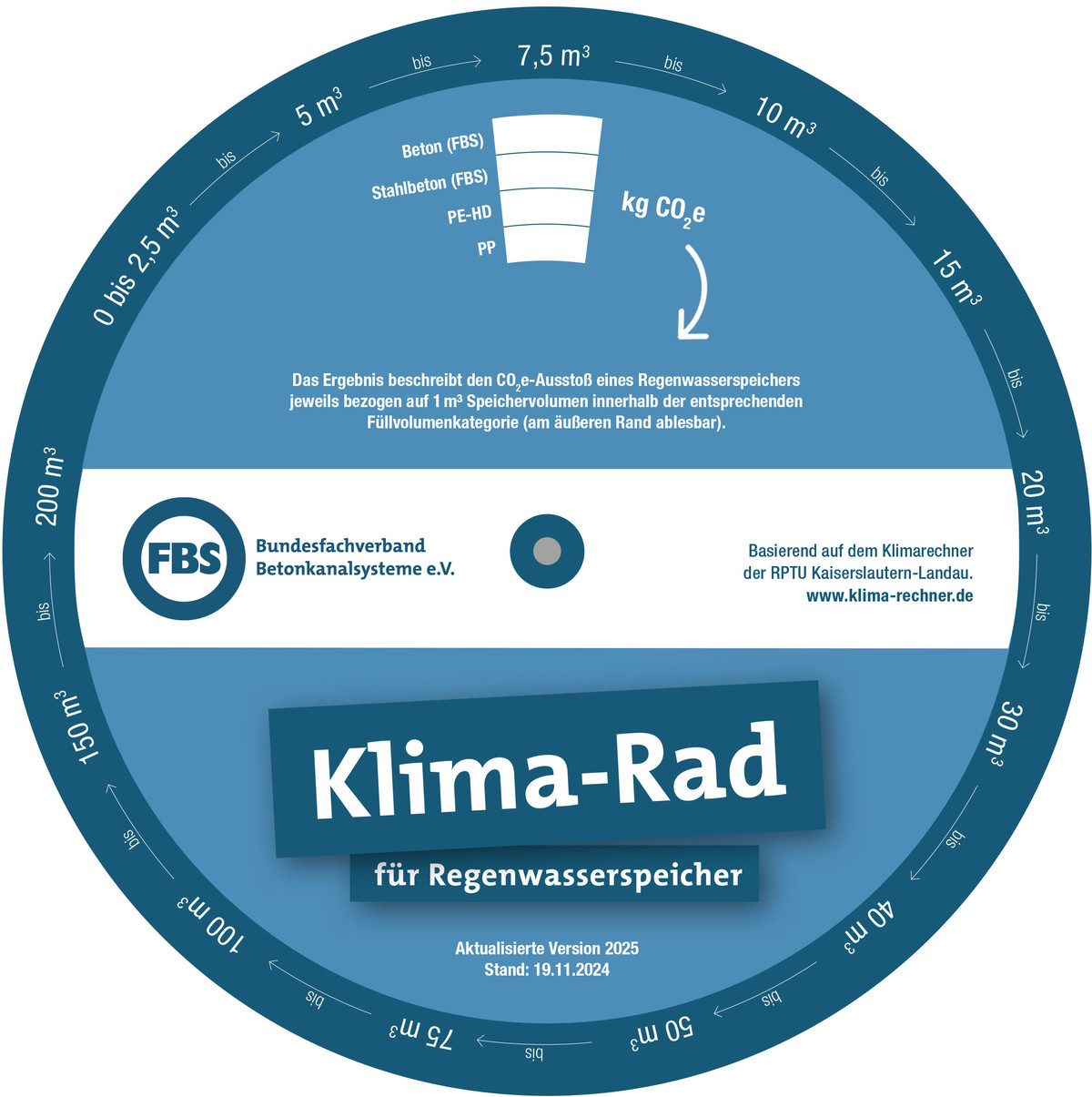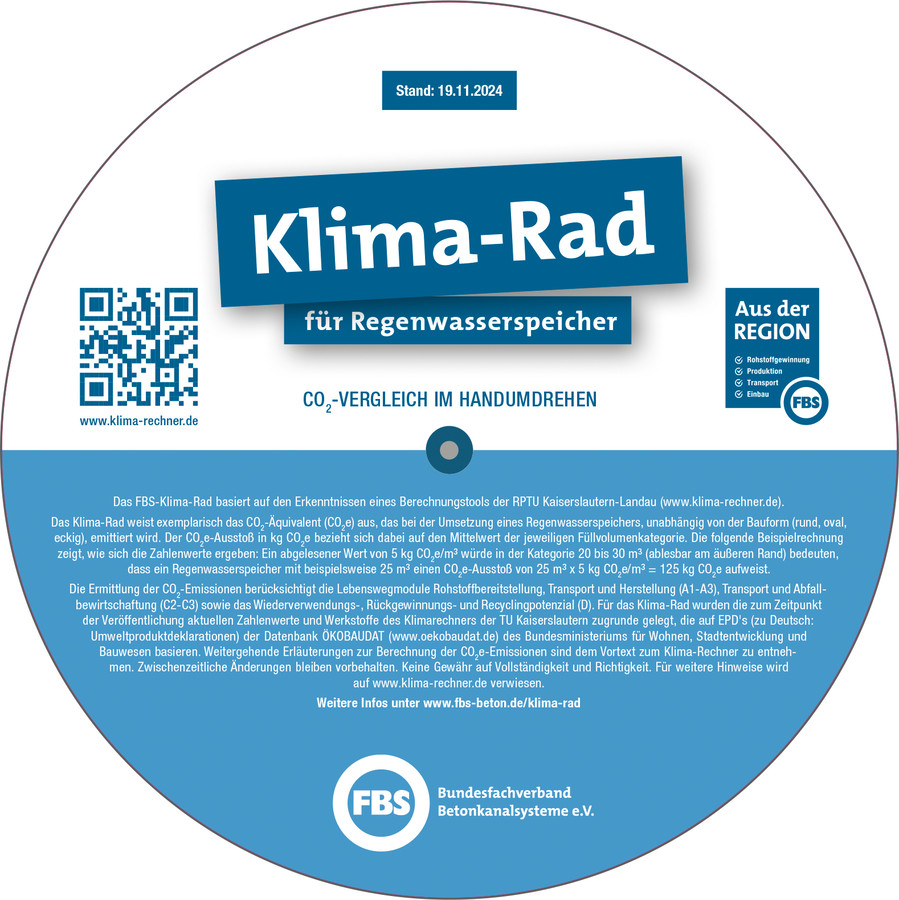 Das Klima-Rad des Bundesfachverbands Betonkanalsysteme e.V. (FBS) vergleicht Regenwasserspeicher aus Beton und Stahlbeton